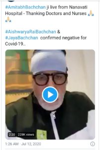 ಆ ಬಳಿಕ ಸಾಮಾಜಿಕ ಜಾಲತಾಣದಲ್ಲಿ ಅಮಿತಾಬ್ ಮತ್ತು ಅಭಿಷೇಕ್ ಬಚ್ಚನ್ ಇಬ್ಬರಿಗೂ ಬೇಗನೆ ಗುಣಮುಖರಾಗಿ ಹಿಂದಿರುಗಿ ಎಂದು ಹಾರೈಸಿದ ಸಂದೇಶಗಳು ಹರಿದಾಡುತ್ತಿವೆ. ಈ ನಡುವೆ ಬಿಗ್ ಬಿ ಅಭಿಮಾನಿಗಳು ಬಿಗ್ ಬಿ ಅಮಿತಾಬ್ ಅವರು ನಾನಾವತಿ ಆಸ್ಪತ್ರೆಯ ವೈದ್ಯರು ಮತ್ತು ಸಿಬ್ಬಂದಿಯನ್ನು ಅವರ ಸೇವೆ ಮತ್ತು ಶ್ರಮಕ್ಕಾಗಿ ಹೊಗಳಿರುವ ವೀಡಿಯೋವೊಂದನ್ನು ಹಂಚಿಕೊಳ್ಳುತ್ತಿದ್ದು, ಅದು ಸಿಕ್ಕಾಪಟ್ಟೆ ವೈರಲ್ ಆಗಿದೆ.