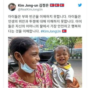 ಕಿಮ್ ಜೊಂಗ್ ಉನ್, ನೀವು ಹೇಗೆ ಇರಿ, ದಯೆ ಎಂಬುವುದು ನಿಮ್ಮನ್ನು ಅತ್ಯಂತ ಸುಂದರ ವ್ಯಕ್ತಿಯನ್ನಾಗಿಸುತ್ತದೆ ಎಂದು ಟ್ವೀಟ್ ಮಾಡಿ, ಭಾರತದ ಬಡ ಮಹಿಳೆ ಸಂತೋಷದಿಂದ ನಗುತ್ತಿರುವ ಮಗುವನ್ನು ಎತ್ತಿಕೊಂಡು, ಆ ಮಗುವಿನ ನಗು ನೋಡಿ ತಾನು ಸಂತೋಷ ಪಡುತ್ತಿರುವ ಪೋಟೋ ಒಂದನ್ನು ಪೋಸ್ಟ್ ಮಾಡಿದ್ದಾರೆ. ಅದರ ಕೆಳಗೆ ಮಕ್ಕಳಿಗೆ ಸಂಪತ್ತು ಮತ್ತು ಹಣ ಅರ್ಥವಾಗುವುದಿಲ್ಲ. ಮಕ್ಕಳು ತಾಯಿಯ ತೋಳಲ್ಲಿ ಸದಾ ಸುರಕ್ಷಿತ ಮತ್ತು ಆನಂದವಾಗಿ ಇರುತ್ತಾರೆ ಎಂದು ಬರೆದು ಕೊಂಡಿದ್ದಾರೆ. ಕಿಮ್ ಜೊಂಗ್ ಉನ್ ಟ್ವೀಟ್ ಗೆ ನೆಟ್ಟಿಗರು ಉತ್ತರ ಕೊರಿಯಾದ ಸರ್ವಾಧಿಕಾರಿ, ಜಗತ್ತನ್ನೆ ಆತಂಕಕ್ಕೆ ದೂಡಿದ ಹುಚ್ಚು ದೊರೆಯ ಬಾಯಲ್ಲಿ ದಯೆಯ ಮಾತುಗಳೇ ಎಂದು ವ್ಯಂಗ್ಯ ಮಾಡಿದ್ದಾರೆ. ದಯೆ, ಕರುಣೆ, ಮಮತೆಯ ಸಂದೇಶ ಸಾರುತ್ತಿರುವ ಸರ್ವಾಕಾರಿಯ ಟ್ವೀಟ್ ಗಳು ಇದೀಗ ಜನರಲ್ಲಿ ನಿಗೂಢತೆಯನ್ನು ಹುಟ್ಟು ಹಾಕಿದೆ.