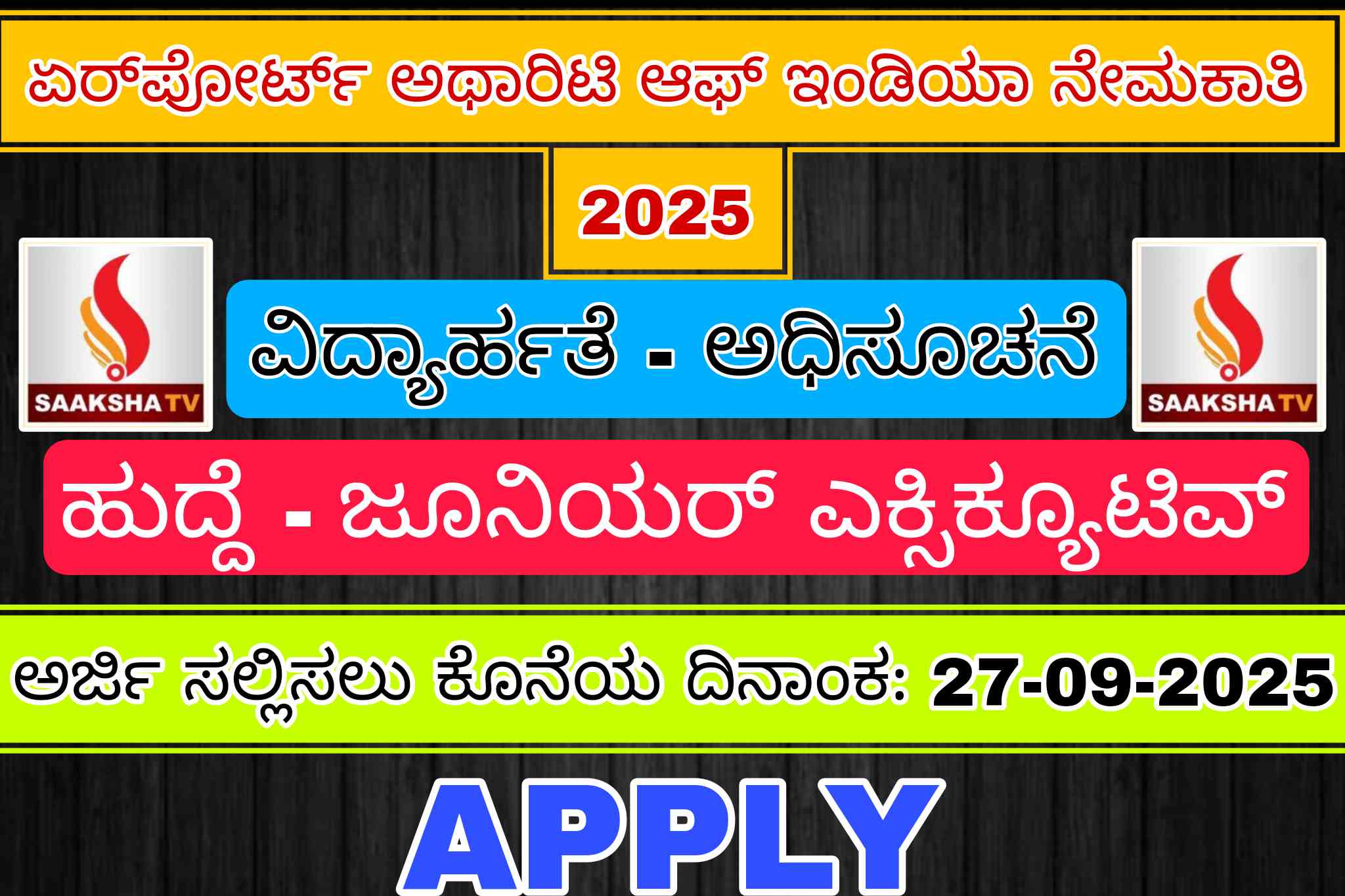 AAI Junior Executive Recruitment 2025 : ಏರ್ಪೋರ್ಟ್ ಅಥಾರಿಟಿ ಆಫ್ ಇಂಡಿಯಾದಲ್ಲಿ ಅಗತ್ಯವಿರುವ ಜೂನಿಯರ್ ಎಕ್ಸಿಕ್ಯೂಟಿವ್ ಹುದ್ದೆಗಳ ಭರ್ತಿಗೆ ಅರ್ಹ ಹಾಗೂ ಆಸಕ್ತ ಅಭ್ಯರ್ಥಿಗಳಿಂದ ಅರ್ಜಿಗಳನ್ನು ಆಹ್ವಾನಿಸಲಾಗಿದೆ.