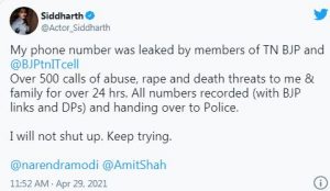 ಸಿದ್ಧಾರ್ಥ್ ತಮ್ಮ ಟ್ವೀಟ್ ನಲ್ಲಿ ತಮಿಳುನಾಡು ಬಿಜೆಪಿ ಹಾಗೂ ತಮಿಳುನಾಡು ಬಿಜೆಪಿ ಐಟಿ ಸೆಲ್ ನವರು ನನ್ನ ಫೋನ್ ನಂಬರ್ ಲೀಕ್ ಮಾಡಿದ್ದಾರೆ. ಸುಮಾರು 500ಕ್ಕೂ ಹೆಚ್ಚು ನಿಂದನೆ, ಅತ್ಯಾಚಾರ ಹಾಗೂ ಕೊಲೆ ಬೆದರಿಕೆಯ ಕರೆಗಳು ಬರುತ್ತಿವೆ.