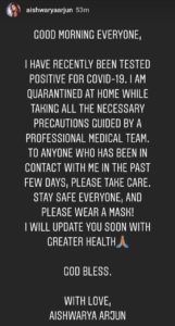 ಬಹುಭಾಷಾ ನಟ ಅರ್ಜುನ್ ಸರ್ಜಾ ಪುತ್ರಿ ಐಶ್ವರ್ಯ ಅವರಿಗೂ ಕೊರೊನಾ ಸೋಂಕಿರುವುದು ದೃಢವಾಗಿದೆ. ಈ ಬಗ್ಗೆ ಅವರೇ ತಮ್ಮ ಇನ್ ಸ್ಟಾಗ್ರಾಂ ನಲ್ಲಿ ಬರೆದುಕೊಂಡಿದ್ದಾರೆ.