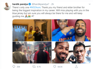 ಆಲ್ರೌಂಡರ್ ಹಾರ್ದಿಕ್ ಪಾಂಡ್ಯ ಧೋನಿ ನಿವೃತಿ ಬಗ್ಗೆ ಟ್ವಿಟ್