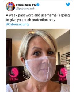 ಭಾರತೀಯ ಪೊಲೀಸ್ (ಐಪಿಎಸ್) ಅಧಿಕಾರಿ ಪಂಕಜ್ ನೈನ್ ತಮ್ಮ ಟ್ವಿಟರ್ ನಲ್ಲಿ ಇದೇ ಸಂದೇಶವನ್ನು ನೀಡಿದ್ದಾರೆ. ನೆಟ್ ಬಟ್ಟೆಯಿಂದ ಮಾಡಿದ ಮಾಸ್ಕ್ ಅನ್ನು ಧರಿಸಿರುವ ಮಹಿಳೆಯ ಚಿತ್ರವನ್ನು ಹಂಚಿಕೊಂಡಿರುವ ಅವರು, ನೆಟ್ ಮಾಸ್ಕ್ ಧರಿಸುವುದು ‘123’ ನಂತಹ ದುರ್ಬಲ ಪಾಸ್ವರ್ಡ್ ಆಯ್ಕೆ ಮಾಡುವುದಕ್ಕೆ ಸಮಾನವಾಗಿದೆ ಎಂದು ಹೇಳಿದ್ದಾರೆ.