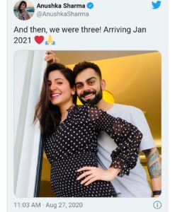ತದನಂತರ, ನಾವು ಮೂವರು! ಜನವರಿ 2021 ಕ್ಕೆ ಮಗುವಿನ ಆಗಮನವಾಗಲಿದೆ ಎಂದು ಟ್ವೀಟ್ ಮಾಡಿದ್ದರೆ, ಕೊಹ್ಲಿ ಕೂಡ ಅದೇ ಪದಗಳನ್ನು ಬರೆದಿದ್ದಾರೆ.