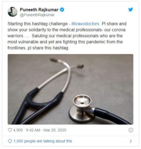 ಕೊರೊನಾ ವಿರುದ್ಧ ಜಾಗೃತಿ ಮೂಡಿಸುವ ಜೊತೆಗೆ ಕೊರೊನಾ ವಿರುದ್ಧ ಧೈರ್ಯವಾಗಿ ಹೋರಾಡುತ್ತಿರೋ ವೈದ್ಯರುಗಳಿಗೆ ಪವರ್ ಸ್ಟಾರ್ ಪುನೀತ್ ರಾಜಕುಮಾರ್ ಅವರು ಕೃತಜ್ಞತೆ ಸಲ್ಲಿಸಿದ್ದಾರೆ. ಇದಕ್ಕಾಗಿ ಅಪ್ಪು ಇದಕ್ಕಾಗಿ ಸೋಶಿಯಲ್ ಮೀಡಿಯಾದಲ್ಲಿ ಹ್ಯಾಷ್ ಟ್ಯಾಗ್ ಬ್ರಾವೋ ಡಾಕ್ಟರ್ಸ್ ಬಳಸಿ ಹೊಸ ಹ್ಯಾಷ್ ಟ್ಯಾಗ್ ಚಾಲೆಂಜ್ ಶುರುಮಾಡಿದ್ದಾರೆ.