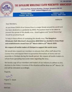 ಬೆಂಗಳೂರು ಹೋಲ್ಸೇಲ್ ಬಟ್ಟೆ ವ್ಯಾಪಾರಿಗಳ ಸಂಘ ಮಾರ್ಚ್ 22 ರಿಂದ 25ರವರೆಗೂ ಚಿಕ್ಕಪೇಟೆಯ ಬಟ್ಟೆ ಅಂಗಡಿಗಳನ್ನು ಬಂದ್ ಮಾಡುವಂತೆ ಮನವಿ ಮಾಡಿದೆ. ಸದಾ ಜನರಿಂದ ತುಂಬುವು ಚಿಕ್ಕಪೇಟೆ ಕೊರೊನಾ ಬೀತಿಯಿಂದ ಬಂದ್ ಆಗುವ ಎಲ್ಲಾ ಲಕ್ಷಣಗಳು ಕಂಡು ಬಂದಿವೆ. ಹಬ್ಬದ ಸಮಯದಲ್ಲಿ ಲೆಕ್ಕವಿಲ್ಲದಷ್ಟು ಜನ ಶಾಪಿಂಗ್ ಮಾಡಲು ಚಿಕ್ಕಪೇಟೆಗೆ ಬರುತ್ತಾರೆ.ಆದ್ದರಿಂದ ಕೊರೊನಾ ಹರಡುವ ಸಾಧ್ಯತೆ ಹೆಚ್ಚಾಗಿರುತ್ತದೆ. ಕೊರೊನಾ ಭೀತಿ ಹೆಚ್ಚಾಗಿರುವ ಹಿನ್ನೆಲೆಯಲ್ಲಿ ಬೆಂಗಳೂರು ಹೋಲ್ಸೇಲ್ ಬಟ್ಟೆ ವ್ಯಾಪಾರಿಗಳ ಸಂಘ ಈ ನಿರ್ಧಾರಕ್ಕೆ ಬಂದಿದೆ. ಕೊರೊನಾ ವೈರಸ್ ಹರಡುವಿಕೆ ಕಡಿಮೆ ಆಗುವವರೆಗೂ ವ್ಯಾಪಾರಸ್ಥರು ಮನೆಯಲ್ಲಿ ಉಳಿಯುವಂತೆ ಮನವಿ ಮಾಡಲಾಗಿದೆ.