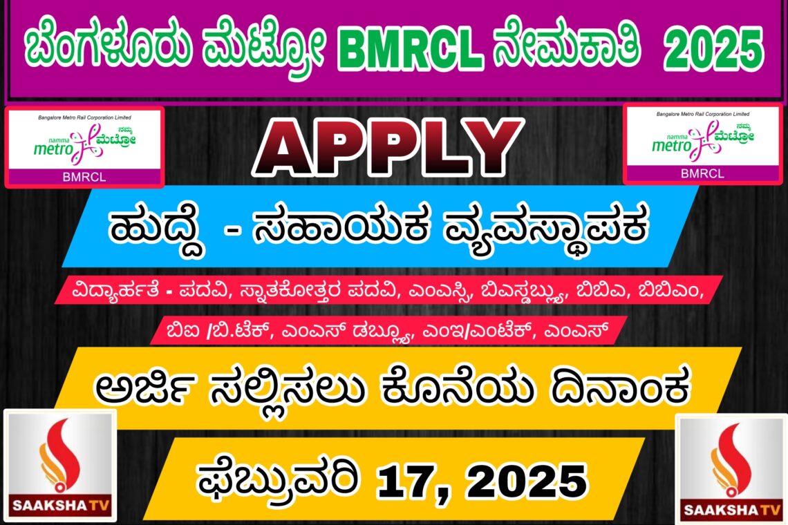 BMRCL Recruitment 2025 – ಬೆಂಗಳೂರು ಮೆಟ್ರೋ ರೈಲು ನಿಗಮ ನಿಯಮಿತ (BMRCL) ನೇಮಕಾತಿ 2025ಕ್ಕೆ ಸಂಬಂಧಿಸಿದಂತೆ ಸಹಾಯಕ ವ್ಯವಸ್ಥಾಪಕ ಹುದ್ದೆಗಳಿಗೆ ಅಧಿಸೂಚನೆಯನ್ನು ಬಿಡುಗಡೆ ಮಾಡಲಾಗಿದೆ. ಆಸಕ್ತ ಅಭ್ಯರ್ಥಿಗಳು ಅಧಿಸೂಚನೆಯನ್ನು ಸಂಪೂರ್ಣವಾಗಿ ಓದಿ ಅರ್ಜಿ ಸಲ್ಲಿಸಬಹುದು.