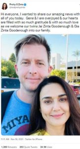 ಪ್ರೀತಿ ಜಿಂಟಾ ಮತ್ತು ಪತಿ ಗುಡ್ ಎನಫ್ ಅವರು ಅವಳಿ ಮಕ್ಕಳನ್ನ ತಮ್ಮ ಲೋಕಕ್ಕೆ ಬರಮಾಡಿಕೊಂಡಿದ್ದಾರೆ. ಬಾಡಿಗೆ ತಾಯ್ತನದ ಮೂಲಕ ಒಂದು ಗಂಡು ಒಂದು ಹೆಣ್ಣು ಮಗುವನ್ನ ಪಡೆದುಕೊಂದಿದ್ದಾರೆ. 2016 ರಲ್ಲಿ ಅಮೇರಿಕಾದ ಜೀನ್ ಜೊತೆ ಪ್ರೀತಿ ಜಿಂಟಾ ವಿವಾಹವಾಗಿದ್ದರು.