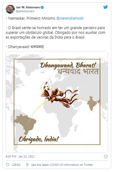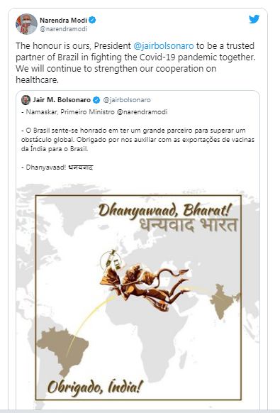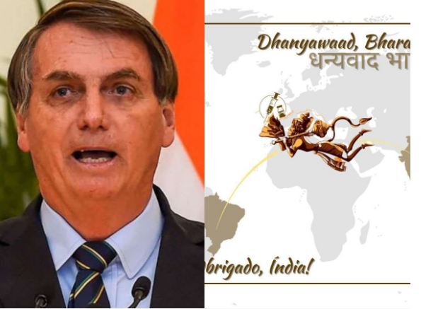 ರಾಮಾಯಣದಲ್ಲಿ ಹನುಮಂತ ದೇವರು ಸಂಜೀವಿನಿ ಪರ್ವತವನ್ನು ಹೊರುವಂತೆ ಭಾರತದಿಂದ ಬ್ರೆಜಿಲ್ಗೆ ಕೋವಿಡ್-19 ಲಸಿಕೆಗಳನ್ನು ಸಾಗಿಸುವ ಚಿತ್ರವನ್ನು ಹಂಚಿರುವ ಬ್ರೆಜಿಲ್ ಅಧ್ಯಕ್ಷ ಜೈರ್ ಬೋಲ್ಸೊನಾರೊ, ಭಾರತ ಹಾಗೂ ಪ್ರಧಾನಿ ನರೇಂದ್ರ ಮೋದಿಗೆ ಧನ್ಯವಾದ ಸಲ್ಲಿಸಿದ್ದಾರೆ. ಈ ಮೂಲಕ ಭಾರತೀಯರರ ಅಪಾರ ಪ್ರೀತಿಗೆ ಪಾತ್ರರಾಗಿದ್ದಾರೆ.