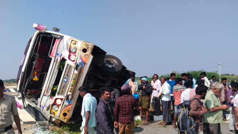 ಈ ಘಟನೆ ಚಿತ್ರದುರ್ಗ (Chitradurga) ಜಿಲ್ಲೆಯ ಚಳ್ಳಕೆರೆ (Challakere) ಪಟ್ಟಣದ ಬಳಿ ನಡೆದಿದೆ. ಮೊಳಕಾಲ್ಮೂರಿನಿಂದ (Molakalmuru) ಚಳ್ಳಕೆರೆಗೆ ಬರುತ್ತಿದ್ದ ಬಸ್ ಅತಿಯಾದ ವೇಗ ಹಾಗೂ ಚಾಲಕನ ಅಜಾಗರೂಕತೆಯಿಂದಾಗಿ ಡಿವೈಡರ್ ಗೆ ಡಿಕ್ಕಿಯಾಗಿದೆ. ಆಗ ಬಸ್ ಪಲ್ಟಿಯಾಗಿದೆ. ಪರಿಣಾಮ ಬಸ್ ನಲ್ಲಿದ್ದ 10 ಜನ ಪ್ರಯಾಣಿಕರಿಗೆ ಸಣ್ಣಪುಟ್ಟ ಗಾಯಗಳಾಗಿವೆ. ಆದರೆ, ಅದೃಷ್ಟವಶಾತ್ ಯಾವುದೇ ಪ್ರಾಣ ಹಾನಿ ಸಂಭವಿಸಿಲ್ಲ.