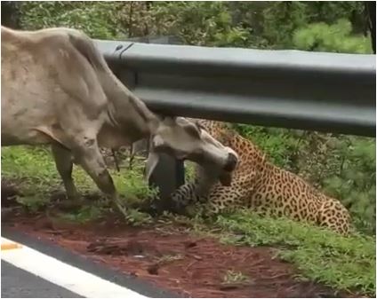 ಚಿರತೆಯು ಹಸುವೊಂದನ್ನು ಭೇಟೆಯಾಡುತ್ತಿರುವ ದೃಶ್ಯ ಇದೀಗ ಸಾಮಾಜಿಕ ಜಾಲತಾಣದಲ್ಲಿ ಹರಿದಾಡುತ್ತಿದೆ.