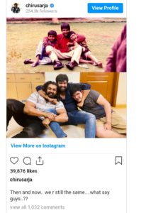 ಲಾಕ್ ಡೌನ್ ಹಿನ್ನೆಲೆಯಲ್ಲಿ ಕುಟುಂಬದ ಜೊತೆ ಸಮಯ ಕಳೆಯುತ್ತಿದ್ದ ಚಿರಂಜೀವಿ ಸರ್ಜಾ, ಸಾಮಾಜಿಕ ಜಾಲತಾಣದಲ್ಲಿ ಸಕ್ರಿಯರಾಗಿರುವ ಮೂಲಕ ಅಭಿಮಾನಿಗಳೊಂದಿಗೆ ಸಮಯವನ್ನು ಕಳೆಯುತ್ತಿದ್ದರು. ನಿನ್ನೆ ಸಹೋದರ ಧೃವ ಸರ್ಜಾ ಜೊತೆಗಿನ ಹಳೆಯ ಮತ್ತು ಈಗಿನ ಪೋಟೋವೊಂದನ್ನು ಹಂಚಿಕೊಂಡಿದ್ದು ಅಂದು-ಇಂದು ನಾವೆಲ್ಲರೂ ಒಂದೇ. ನೀವು ಏನ್ ಹೇಳ್ತೀರಿ ಎಂದು ಬರೆದು ಕೊಂಡಿದ್ದರು.