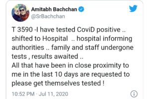 ಸ್ವತಃ ಅಮಿತಾಭ್ ಬಚ್ಚನ್ ಅವರೇ ತಮ್ಮ ಟ್ವಿಟರ್ ಖಾತೆಯ ಮುಖಾಂತರ ತಮಗೆ ಕೊರೊನಾ ಸೋಂಕು ತಗುಲಿರುವ ಬಗ್ಗೆ ಮಾಹಿತಿ ನೀಡಿದ್ದಾರೆ. ನನಗೆ ಕೋವಿಡ್-19 ಸೋಂಕು ದೃಢಪಟ್ಟಿದ್ದು, ನಾನು ಆಸ್ಪತ್ರೆಗೆ ದಾಖಲಾಗಿದ್ದೇನೆ. ನನ್ನ ಪ್ರಾಥಮಿಕ ಸಂಪರ್ಕದಲ್ಲಿದ್ದ ಕುಟುಂಬದವರು, ಸಿಬ್ಬಂದಿಗಳು ಕೊರೊನಾ ತಪಾಸಣೆಗೆ ಒಳಪಟ್ಟಿದ್ದು ಅವರ ವರದಿಗಾಗಿ ಕಾಯುತ್ತಿದ್ದೇವೆ ಎಂದು ಟ್ವೀಟ್ನಲ್ಲಿ ತಿಳಿಸಿದ್ದಾರೆ.