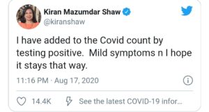 ಬಯೋಕಾನ್ ಅಧ್ಯಕ್ಷೆ ಕಿರಣ್ ಮಜುಂದಾರ್-ಶಾಗೆ ಕೊರೋನಾ ಸೋಂಕು