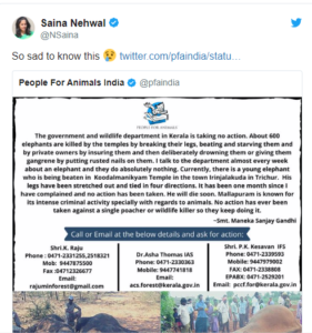 ಇನ್ನು ಭಾರತದ ಸ್ಟಾರ್ ಬ್ಯಾಡ್ಮಿಂಟನ್ ಆಟಗಾರ್ತಿ ಸೈನಾ ನೆಹ್ವಾಲ್ ಕೂಡ ಈ ಘಟನೆಯನ್ನು ಖಂಡಿಸಿದ್ದಾರೆ. ಪೀಪಲ್ ಫಾರ್ ಅನಿಮಲ್ಸ್ ಇಂಡಿಯಾದ ಪೋಸ್ಟ್‍ಗೆ ಕ್ರೂರತೆಯ ಬಗ್ಗೆ ಉತ್ತರಿಸುವ ಮೂಲಕ ಈ ಕೃತ್ಯಕ್ಕೆ ಆಕ್ರೋಶ ವ್ಯಕ್ತಪಡಿಸಿದ್ದಾರೆ. ಈ ಘಟನೆಯನ್ನು ಕೇಳಿ ತಿಳಿದಾಗ ತುಂಬಾ ದುಃಖವಾಗಿತ್ತು ಅಂತ ಹೇಳಿದ್ದಾರೆ.