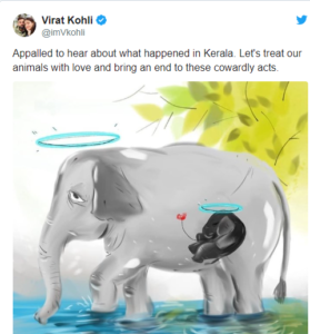ಈ ಬಗ್ಗೆ ಭಾರತದ ಕ್ರೀಡಾಪಟುಗಳು ತಮ್ಮ ಸಾಮಾಜಿಕ ಜಾಲ ತಾಣದಲ್ಲಿ ಈ ಘಟನೆಯನ್ನು ಖಂಡಿಸಿದ್ದಾರೆ. ಅದ್ರಲ್ಲೂ ಮುಖ್ಯವಾಗಿ ಟೀಮ್ ಇಂಡಿಯಾದ ವಿರಾಟ್ ಕೊಹ್ಲಿ ಕೂಡ ಒಬ್ಬರು. ಕೇರಳದಲ್ಲಿ ನಡೆದ ಘಟನೆಯನ್ನು ಕೇಳಿ ದಿಗಿಲುಗೊಂಡಿದ್ದೇನೆ. ಪ್ರಾಣಿಗಳನ್ನು ಪ್ರೀತಿಯಿಂದ ನೋಡಿಕೊಳ್ಳೋಣ. ಆದ್ರೆ ಈ ಇಂತಹ ಹೇಡಿತನದ ಕೃತ್ಯಗಳಿಗೆ ಅಂತ್ಯ ಹಾಡೋಣ ಅಂತ ವಿರಾಟ್ ಕೊಹ್ಲಿ ಹೇಳಿದ್ದಾರೆ.