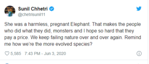 ಪಾಪ ಅದು ಗರ್ಭಿಣಿ ಆನೆ. ಜನರಿಗೆ ಯಾವುದೇ ತೊಂದರೆಯನ್ನು ಉಂಟು ಮಾಡಲಿಲ್ಲ. ಜನ ಮಾಡಿರುವ ಕೃತ್ಯ ಮಾತ್ರವನ್ನು ಸಹಿಸಲು ಸಾಧ್ಯವಿಲ್ಲ. ಅವರಿಗೆ ತಕ್ಕ ಶಿಕ್ಷೆ ಆಗಲೇಬೇಕು. ನಾವು ಪ್ರಕೃತಿಯ ವಿರುದ್ಧವೇ ಮತ್ತೆ ಮತ್ತೆ ಹೋಗುತ್ತಿದ್ದೇವೆ ಎಂದು ಭಾರತ ಫುಟ್ ಬಾಲ್ ತಂಡದ ನಾಯಕ ಸುನೀಲ್ ಚೆಟ್ರಿ ಹೇಳಿದ್ದಾರೆ.