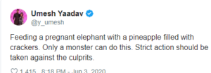 ಹಾಗೇ ಟೀಮ್ ಇಂಡಿಯಾದ ವೇಗಿ ಉಮೇಶ್ ಯಾದವ್ ಕೂಡ ಈ ಘಟನೆಯನ್ನು ಖಂಡಿಸಿದ್ದಾರೆ. ಇದೊಂದು ರಕ್ಕಸ ಪ್ರವೃತ್ತಿಯದ್ದು. ತಿನ್ನುವ ಅನಾನಸ್ ನಲ್ಲಿ ಪಟಾಕಿ ಇಟ್ಟು ಗರ್ಭಿಣಿ ಆನೆಗೆ ಕೊಟ್ಟಿರುವುದು ಮನುಷ್ಯತ್ವವೇ ಇಲ್ಲದವರು. ಕ್ರೂರಿಗಳು ಮಾತ್ರ ಇದನ್ನು ಮಾಡಲು ಸಾಧ್ಯ. ತಪ್ಪಿತಸ್ಥರಿಗೆ ತಕ್ಕ ಶಿಕ್ಷೆ ಆಗಲೇ ಬೇಕು ಎಂದು ಉಮೇಶ್ ಯಾದವ್ ಆಗ್ರಹಿಸಿದ್ದಾರೆ.
