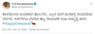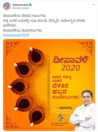 ‘ದೀಪಂ ಜ್ಯೋತಿ ಪರಂ ಬ್ರಹ್ಮಾ ದೀಪಂ ಸರ್ವ ತಮೋಪಹಂ| ಇಷ್ಟಾ ಕಾಮ್ಯಾರ್ಥ ಸಿದ್ಧ್ಯರ್ಥಂ ದೀಪಂ ಪ್ರಜ್ಯಾಲಯಾಮ್ಯಾಹಂ|| ನಾಡಿನ ಸಮಸ್ತ ಜನತೆಗೆ ದೀಪಾವಳಿ ಹಬ್ಬದ ಹಾರ್ದಿಕ ಶುಭಾಶಯಗಳು. ಬೆಳಕಿನ ಹಬ್ಬ ದೀಪಾವಳಿ ಎಲ್ಲರ ಬದುಕಿನಲ್ಲಿ ಹೊಸ ಬೆಳಕು ಮೂಡಿಸಲಿ. ಹಬ್ಬದ ಸಂಭ್ರಮವಿರಲಿ, ಕೊರೊನಾ ವಿರುದ್ಧದ ಹೋರಾಟ ನೆನಪಿರಲಿ’ ಎಂದಿದ್ದಾರೆ.