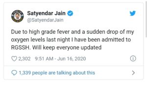 ಟ್ವಿಟರ್ ನಲ್ಲಿ ತಾವು ಆಸ್ಪತ್ರೆಗೆ ದಾಖಲಾಗಿರುವುದನ್ನು ದೃಢೀಕರಿಸಿರುವ ಸತ್ಯೇಂದರ್ ಜೈನ್ ‘ಕಳೆದ ರಾತ್ರಿ ತೀವ್ರ ಜ್ವರ ಮತ್ತು ನನ್ನ ಆಮ್ಲಜನಕದ ಮಟ್ಟ ಹಠಾತ್ತನೆ ಕುಸಿದ ಕಾರಣ ನನ್ನನ್ನು ಆರ್ಜಿಎಸ್ಎಸ್ಎಚ್ಗೆ ದಾಖಲಿಸಲಾಗಿದೆ ಎಂದು ಟ್ವೀಟ್ ಮಾಡಿದ್ದಾರೆ.