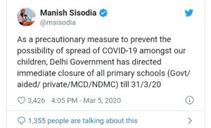 ಉಪಮುಖ್ಯಮಂತ್ರಿಯೂ ಆಗಿರುವ ಶ್ರೀ ಸಿಸೋಡಿಯಾ ಅವರು ತಮ್ಮ ಅಧಿಕೃತ ಟ್ವಿಟರ್ ಖಾತೆಯಲ್ಲಿ ‘ ನಮ್ಮ ಮಕ್ಕಳಲ್ಲಿ COVID-19 ಹರಡುವ ಸಾಧ್ಯತೆಯನ್ನು ತಡೆಗಟ್ಟುವ ಮುನ್ನೆಚ್ಚರಿಕೆ ಕ್ರಮವಾಗಿ, ದೆಹಲಿ ಸರ್ಕಾರವು ಎಲ್ಲಾ ಪ್ರಾಥಮಿಕ ಶಾಲೆಗಳನ್ನು (ಸರ್ಕಾರಿ / ಅನುದಾನಿತ / ಖಾಸಗಿ / ಎಂಸಿಡಿ / ಎನ್ಡಿಎಂಸಿ) 31/3/20 ರವರೆಗೆ ತಕ್ಷಣ ರಜೆ ನೀಡುವಂತೆ ನಿರ್ದೇಶಿಸಿದೆ’ ಎಂದು ಟ್ವೀಟ್ ಮಾಡಿದ್ದಾರೆ.