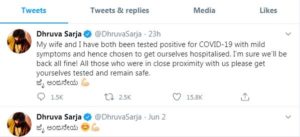 ಆಕ್ಷನ್ ಪ್ರಿನ್ಸ್ ಧ್ರುವ ಸರ್ಜಾ ಹಾಗೂ ಅವರ ಪತ್ನಿಗೂ ಕೊರೊನಾ ಪಾಸಿಟಿವ್ ಬಂದಿದ್ದ ಬೆನ್ನಲ್ಲೇ ನಿನ್ನೆ ದಂಪತಿಗಳಿಬ್ಬರೂ ಆಸ್ಪತ್ರೆಗೆ ದಾಖಲಾಗಿದ್ದರು. ಈ ಬಗ್ಗೆ ಸ್ವತಃ ಧ್ರುವ ಸರ್ಜಾ ಅವರೇ ಟ್ವಿಟ್ಟರ್ ನಲ್ಲಿ ಸ್ಪಷ್ಟಪಡಿಸಿದ್ರು. ಕೊರೊನಾ ಟೆಸ್ಟ್ ಮಾಡಿಸಿದ್ದು, ರಿಪೋರ್ಟ್ ಪಾಸಿಟಿವ್ ಬಂದಿದೆ. ಕೆಲ ಸಾಮಾನ್ಯ ರೋಗಲಕ್ಷಣಗಳಿದ್ದು ನಾವಿಬ್ಬರೂ ಆಸ್ಪತ್ರೆಗೆ ದಾಖಲಾಗಿ ಚಿಕಿತ್ಸೆ ಪಡೆಯುತ್ತಿದ್ದೇವೆ ಎಂದು ಹೇಳಿಕೊಂಡಿದ್ರು.. ಆದ್ರೆ ಇದೀಗ ಧ್ರುವ ಹಾಗೂ ಅವರ ಪತ್ನಿ ಆಸ್ಪತ್ರೆಯಿಂದ ಡಿಶ್ಚಾರ್ಜ್ ಆಗಿದ್ದಾರೆ.