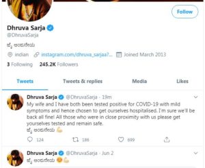 ಹೌದು ಈ ಬಗ್ಗೆ ಸ್ವತಃ ಧ್ರುವ ಸರ್ಜಾ ಅವರೇ ತಮ್ಮ ಟ್ವಿಟ್ಟರ್ ಮೂಲಕ ಅಧಿಕೃತವಾಗಿ ಮಾಹಿತಿ ಹಂಚಿಕೊAಡಿದ್ದಾರೆ. ನನಗೆ ಹಾಗೂ ನನ್ನ ಪತ್ನಿಗೆ ಕೊರೊನಾ ಪಾಸಿಟಿವ್ ಇದ್ದು, ಆಸ್ಪತ್ರೆಗೆ ದಾಖಲಾಗಿ ಚಿಕಿತ್ಸೆ ಪಡೆಯುತ್ತಿದ್ದೇವೆ. ನಾವು ಆದಷ್ಟು ಬೇಗನೇ ಗುಣಮುಖರಾಗುತ್ತೇವೆ. ನನ್ನ ಜೊತೆಗೆ ಪ್ರಾಥಮಿಕವಾಗಿ ಸಂರ್ಕ ಹೊಂದಿದ್ದ ಎಲ್ಲರೂ ದಯಮಾಡಿ ವೈದ್ಯಕೀಯ ಪರೀಕ್ಷೆಗೆ ಒಳಪಡಿ ಹಾಗೂ ಸುರಕ್ಷಿತವಾಗಿರಿ ಎಂದು ಮನವಿ ಮಾಡಿಕೊಂಡಿದ್ದಾರೆ. ಇನ್ನೂ ಆಕ್ಷನ್ ಪ್ರಿನ್ಸ್ ಗೆ ಕೊರೊನಾ ಪಾಸಿಟಿವ್ ಇರುವುದು ಅವರ ಅಭಿಮಾನಿಗಳಿಗೆ ಆತಂಕ ತಂದ್ದೊಡ್ಡಿದೆ.