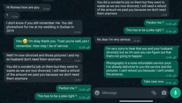 ಆದರೆ ಇಲ್ಲೊಂದು ವಿಚಿತ್ರ ಘಟನೆಯೊಂದು ಬೆಳಕಿಗೆ ಬಂದಿದೆ. ದಕ್ಷಿಣ ಆಫ್ರಿಕಾದ ಮಹಿಳೆಯೊಬ್ಬರು ತನ್ನ ಮದುವೆಯ ಫೋಟೋಗಳನ್ನು ತೆಗೆದ ಛಾಯಾಗ್ರಾಹಕ, ತನಗೆ ಹಣವನ್ನು ವಾಪಸ್ ನೀಡಬೇಕು ಎಂದು ಕೇಳಿದ್ದಾರೆ. ಫೋಟೋಗ್ರಾಫರ್ ಗೆ ಸುಮಾರು ನಾಲ್ಕು ವರ್ಷಗಳ ನಂತರ ವಾಟ್ಸ್ ಆಪ್ ಮೆಸೆಜ್ ಮಾಡಿ ಸಂಪರ್ಕಿಸಿದ್ದಾರೆ. ಅಲ್ಲದೇ, ವಿಚ್ಛೇದನದ ಕುರಿತು ಹೇಳಿ ಫೋಟೋಗಳಿಗೆ ತೆಗೆದುಕೊಂಡ ಹಣವನ್ನು ಮರುಪಾವತಿ ಮಾಡುವಂತೆ ಕೋರಿದ್ದಾರೆ.