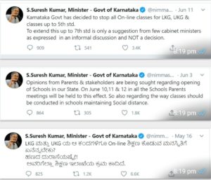 ಒಂದು ಕಡೆ ಪೋಷಕರಿಂದ ಮಕ್ಕಳ ಶಾಲಾ ಶುಲ್ಕ ಪಾವತಿಸಲು ಬೇಡಿಕೆ ಸಲ್ಲಿಸಿದರೆ ಇನ್ನೊಂದು ಕಡೆ ಸರಕಾರದ ಮೇಲೆ ಶಾಲಾ ಕಾಲೇಜು ಪುನಾರಂಭಿಸಲು ಸತತ ಬೇಡಿಕೆ ಸಲ್ಲಿಸಿದರು. ಈ ನಡುವೆ ಶಾಲಾ ಕಾಲೇಜುಗಳ ದಂದೆಯನ್ನು ಬಟಾ ಬಯಲು ಮಾಡಿದ ಕೆಲ ಪೋಷಕರ ಮೇಲೆ ಕಾನೂನು ಕ್ರಮ ಕೈಗೊಳ್ಳುವುದಾಗಿ ನೋಟೀಸ್ ನೀಡಿದ್ದು ಇದೆ. ಏತನ್ಮಧ್ಯ ಕೆಲವು ಪೋಷಕರು ಮಕ್ಕಳಿಗೆ ಕ್ಲಾಸ್ ಶುರು ಮಾಡಲೇ ಬೇಕೆಂದು ಪಟ್ಟು ಹಿಡಿದರೆ ಇನ್ನು ಹೆಚ್ಚಿನ ಜನ ಈ ವರ್ಷ ಶಾಲೆಗಳು ಬೇಡವೇ ಬೇಡ ಅಥವಾ ಸಾಂಕ್ರಾಮಿಕ ರೋಗ ಮುಗಿದ ಮೇಲೆ ಆಲೋಚನೆ ಮಾಡುವ ಎನ್ನುವ ನಿರ್ಧಾರಕ್ಕೂ ಬಂದಿದ್ದರು. ಇದಕ್ಕೆ ಪೂರಕವಾಗಿ ನಮ್ಮ ರಾಜ್ಯದ ಶಿಕ್ಷಣ ಸಚಿವ ಸುರೇಶ ಕುಮಾರ್ ಸ್ಪಂದಿಸಿದರೆ, ಅದೇಕೋ ಅವರ ಕೊಟ್ಟ ಮಾತು ದಿನದಿಂದ ದಿನಕ್ಕೆ ಶಿಕ್ಷಣ ಪದ್ಧತಿಯನ್ನು ಕಪಿಮುಷ್ಟಿಯಲ್ಲಿ ಹಿಡಿದ ಬಂಡವಾಳಶಾಹಿ ಪಾರುಪತ್ಯಕ್ಕೆ ಶರಣಾದಂತೆ ಕಂಡಿತು.