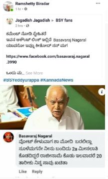 ಪಂಚಮಸಾಲಿ ಲಿಂಗಾಯತ 2ಎ ಮೀಸಲಾತಿ ಹೋರಾಟದಲ್ಲಿ ಫೆ.20 ಮುಖ್ಯಮಂತ್ರಿ ಸಾವು ಖಚಿತ ಅಂತ ಕಮೆಂಟ್ ಹಾಕಿದ ಬಸವರಾಜ್ ನಾಗರಾಳ ಎಂಬ ವ್ಯಕ್ತಿ ವಿರುದ್ದ ಇದೀಗ ಬೀದರ್ ಜಿಲ್ಲೆ ಮನ್ನಳ್ಳಿ ಪೊಲೀಸ್ ಠಾಣೆಯಲ್ಲಿ ಪ್ರಕರಣ ದಾಖಲಾಗಿದೆ. ಬಿಜೆಪಿ ಮುಖಂಡ ಘಾಳೆಪ್ಪಾ ಚಟ್ನಳ್ಳಿ ದೂರು ದಾಖಲಿಸಿದ್ದು, ಮುನ್ನಳ್ಳಿ ಪೊಲೀಸರು FIR ದಾಖಲಿಸಿದ್ದಾರೆ.