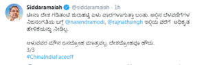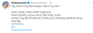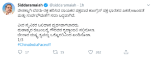 ಹಾಗೇ ಮುಂದುವರಿದು ಸರಣಿ ಟ್ವೀಟ್ ಗಳನ್ನು ಮಾಡಿರುವ ಅವರು, ದೇಶಕ್ಕಾಗಿ ಬೆವರು-ರಕ್ತ ಹರಿಸಿದ ನಾಯಕರ ಪಕ್ಷವಾದ ಕಾಂಗ್ರೆಸ್ ಪಕ್ಷ ಭಾರತದ ಏಕತೆ, ಅಖಂಡತೆ ಮತ್ತು ಸಾರ್ವಭೌಮತೆಗೆ ಸದಾ ಬದ್ಧವಾಗಿದೆ. ವೀರ ಸೈನಿಕರ ಬಲಿದಾನ ವ್ಯರ್ಥವಾಗಬಾರದು. ಹುತಾತ್ಮರ ಕುಟುಂಬಕ್ಕೆ ಗೌರವದ ಶ್ರದ್ಧಾಂಜಲಿ ಸಲ್ಲಿಸೋಣ. ಚೀನಾದ ದುಷ್ಕೃತ್ಯವನ್ನು ಒಕ್ಕೊರಲಿನಿಂದ ಖಂಡಿಸೋಣ ಎಂದು ಸಿದ್ದರಾಮಯ್ಯ ಭಾರತ-ಚೀನಾ ಯೋಧ ನಡುವಿನ ಸಂಘರ್ಷದಲ್ಲಿ ಹುತಾತ್ಮರಾದ ಭಾರತೀಯ ಯೋಧರಿಗೆ ಗೌರವ ನಮನ ಸಲ್ಲಿಸಿದ್ದಾರೆ.