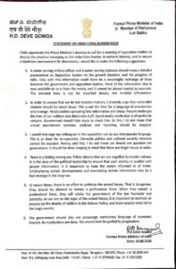 ಶುಕ್ರವಾರ ಭಾರತ-ಚೀನಾ ಗಡಿ ಸಮಸ್ಯೆ ಕುರಿತು ಚರ್ಚಿಸಲು ಪ್ರಧಾನಿ ನರೇಂದ್ರ ಮೋದಿ ಸರ್ವ ಪಕ್ಷಗಳ ಸಭೆ ಕರೆದಿದ್ದರು. ಈ ಬಗ್ಗೆ ಹರ್ಷ ವ್ಯಕ್ತಪಡಿಸಿರುವ ಮಾಜಿ ಪ್ರಧಾನಿ ಎಚ್ ಡಿ ದೇವೇಗೌಡ ಎಲ್ಲಾ ನಾಯಕರ ಸಲಹೆ ಸೂಚನೆಗಳನ್ನು ಪ್ರಧಾನಿ ಮೋದಿ ಪರಿಗಣಿಸುತ್ತಿರುವುದಕ್ಕೆ ಅಭಿನಂದನೆ ತಿಳಿಸಿದ್ದಾರೆ.