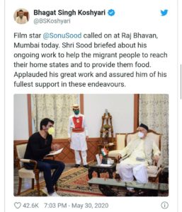 ಮಹಾರಾಷ್ಟ್ರ ರಾಜ್ಯಪಾಲ ಭಗತ್ ಸಿಂಗ್ ಕೋಶಿಯಾರಿ ಈ ಬಗ್ಗೆ ತಮ್ಮ ಟ್ವಿಟರ್ ಖಾತೆಯಲ್ಲಿ ‘ಮುಂಬೈನ ರಾಜ್ ಭವನದಲ್ಲಿ ನಟ ಸೋನು ಸೂದ್ ಇಂದು ಭೇಟಿಯಾದರು. ಶ್ರೀ ಸೋನು ಸೂದ್, ವಲಸೆ ಕಾರ್ಮಿಕರನ್ನು ಅವರವರ ರಾಜ್ಯಗಳಿಗೆ ತಲುಪಿಸಲು ಕೈಗೊಂಡಿರುವ ಕ್ರಮಗಳನ್ನು ಮತ್ತು ಅವರಿಗೆ ಆಹಾರವನ್ನು ಒದಗಿಸಲು ಸಹಾಯ ಮಾಡುತ್ತಿರುವ ತಮ್ಮ ಕಾರ್ಯಗಳ ಬಗ್ಗೆ ವಿವರಿಸಿದರು. ಅವರ ಮಹತ್ಕಾರ್ಯವನ್ನು ಶ್ಲಾಘಿಸಿ, ಈ ಪ್ರಯತ್ನಗಳಿಗೆ ಸಂಪೂರ್ಣ ಬೆಂಬಲವನ್ನು ಭರವಸೆ ನೀಡಿದೆ’ ಎಂದು ಟ್ವೀಟ್ ಮಾಡಿದ್ದಾರೆ.