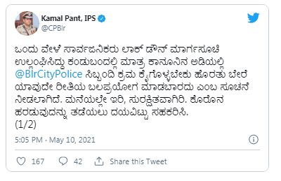 ಒಂದು ವೇಳೆ ಸಾರ್ವಜನಿಕರು ಲಾಕ್ಡೌನ್ ಮಾರ್ಗಸೂಚಿ ಉಲ್ಲಂಘಿಸಿದ್ದು, ಕಂಡುಬಂದಲ್ಲಿ ಮಾತ್ರ ಕಾನೂನಿನ ಅಡಿಯಲ್ಲಿ ಬೆಂಗಳೂರು ಪೊಲೀಸ್ ಸಿಬ್ಬಂದಿ ಕ್ರಮ ಕೈಗೊಳ್ಳಬೇಕೆ ಹೊರತು ಬೇರೆ ಯಾವುದೇ ರೀತಿಯ ಬಲಪ್ರಯೋಗ ಮಾಡಬಾರದು ಎಂಬ ಸೂಚನೆ ನೀಡಲಾಗಿದೆ. ಮನೆಯಲ್ಲಿ ಸುರಕ್ಷಿತವಾಗಿರಿ, ಕೊರೋನಾ ಹರಡುವುದನ್ನು ತಡೆಯಲು ದಯವಿಟ್ಟು ಸಹಕರಿಸಿ ಎಂದು ಸಾರ್ವಜನಿಕರಲ್ಲಿ ಮನವಿ ಮಾಡಿದ್ದಾರೆ.