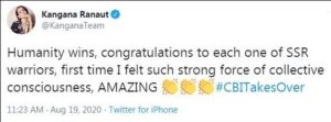 ಸುಪ್ರೀಂ ಕೋರ್ಟ್ ಈ ಪ್ರಕರಣವನ್ನು ಸಿಬಿಐಗೆ ಒಪ್ಪಿಸುವಂತೆ ಆದೇಶಿಸುವ ಜೊತೆಗೆ ರಿಯಾ ಸಲ್ಲಿಸಿದ್ದ ಕೇಸ್ ವರ್ಗಾವಣೆ ಅರರ್ಜಿಯನ್ನೂ ಸಹ ತಿರಸ್ಕರಿಸಿದೆ. ಹೀಗಾಗಿ ಈ ವಿಚಾರವಾಗಿ ನಟಿ ಕಂಗನಾ ಟ್ವೀಟ್ ಮೂಲಕ ಸಂತಸ ವ್ಯಕ್ತಪಡಿಸಿದ್ದು, ನ್ಯಾಯಾಲಯದ ತೀರ್ಪನ್ನು ಸ್ವಾಗತಿಸಿದ್ದಾರೆ. “ ಮಾನವೀಯತೆ ಗೆದ್ದಿದೆ. ಸುಶಾಂತ್ ಸಿಂಗ್ ಗೆ ನ್ಯಾಯ ಕೊಡಿಸುವುದಕ್ಕಾಗಿ ಹೋರಾಡಿದ ಎಲ್ಲರಿಗೂ ಅಭಿನಂದನೆಗಳು. ಮೊದಲ ಬಾರಿಗೆ ನಾನು ಸಾಮೂಹಿಕ ಪ್ರಜ್ಞೆಯ ಬಲವಾದ ಬಲವನ್ನು ಅನುಭವಿಸಿದೆ. ಅಮೇಜಿಂಗ್” ಎಂದು ಬರೆದುಕೊಂಡು ಖುಷಿ ಹಂಚಿಕೊಂಡಿದ್ದಾರೆ ಕ್ವೀನ್ ಕಂಗನಾ.