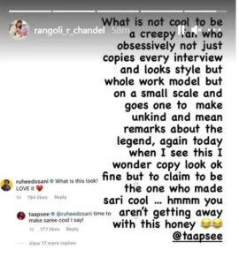 ಬಳಿಕ ತಾಪ್ಸಿ ವಿದೇಶದಲ್ಲಿ ಸೀರೆ ಧರಿಸಿ ಓಡಾಡುತ್ತಿರುವ ಫೋಟೋ ಶೇರ್ ಮಾಡಿ,  ಕಂಗನಾರನ್ನು ಕಾಪಿ ಮಾಡಿದ್ದಾರೆ ಎಂದು ಹೇಳಿದ್ದಾರೆ. ಈ ಪೋಸ್ಟ್‌ನಲ್ಲಿ ‘ಸ್ವಂತ ಪ್ರತಿಭೆ ಇಲ್ಲದಿರುವುದರಿಂದ ಕಂಗನಾರನ್ನೇ ಕಾಪಿ ಮಾಡಿದ್ದೀರಾ. ಇದು ಚೀಪ್ ಅನುಕರಣೆ’ಎಂದು  ಬರೆದುಕೊಂಡಿದ್ದಾರೆ.