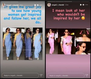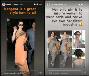 ಹೌದು..  ಸಹೋದರಿ ಕಂಗನಾ ರಣಾವತ್ ಫೋಟೋಗಳನ್ನು ಹಂಚಿಕೊಂಡು ಹಾಡಿ ಹೊಗಳಿದ್ದಾರೆ. ಕಂಗನಾ ಸೀರೆ ಧರಿಸಿರುವ ಫೋಟೋಗಳನ್ನು ಶೇರ್ ಮಾಡಿ, ‘ಗ್ರೇಟ್ ಸ್ಟೈಲ್ ಐಕಾನ್’ , ‘ಯುವತಿಯರು ಹೇಗೆ ಸ್ಫೂರ್ತಿ ಪಡೆಯುತ್ತಾರೆ ಮತ್ತು ಅವಳನ್ನು ಅನುಸರಿಸುತ್ತಾರೆ ಎಂದು ನೋಡಲು ತುಂಬಾ ಸಂತೋಷವಾಗುತ್ತೆ, ಅನೇಕರು ಕಂಗನಾರನ್ನು ಫೋಲೋ ಮಾಡುತ್ತಿದ್ದಾರೆ’ ಎಂದು ಹೊಗಳಿದ್ದಾರೆ.