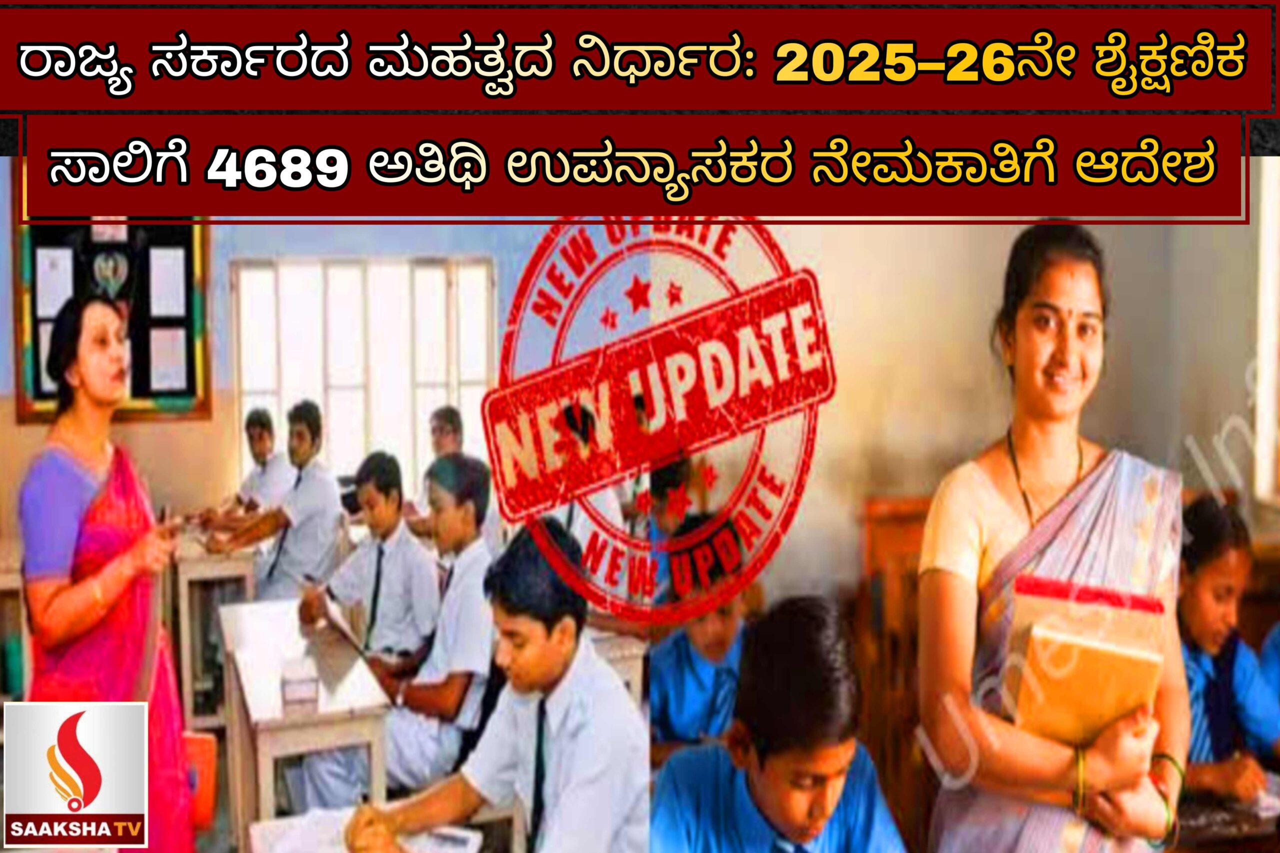 ರಾಜ್ಯದ ಪದವಿ ಪೂರ್ವ ಶಿಕ್ಷಣ ಇಲಾಖೆಯಲ್ಲಿ ಖಾಲಿಯಾಗಿರುವ ಉಪನ್ಯಾಸಕರ ಹುದ್ದೆಗಳಿಗೆ 2025–26ನೇ ಶೈಕ್ಷಣಿಕ ಸಾಲಿನಲ್ಲಿ ಅತಿಥಿ ಉಪನ್ಯಾಸಕರನ್ನು ನಿಯೋಜಿಸಲು ಕರ್ನಾಟಕ ಸರ್ಕಾರ ಮಹತ್ವದ ಆದೇಶ ಹೊರಡಿಸಿದೆ. ಈ ನಿಯಮದಡಿಯಲ್ಲಿ ರಾಜ್ಯದ ಸರ್ಕಾರಿ ಪಿಯು ಕಾಲೇಜುಗಳಲ್ಲಿ 4689 ಅತಿಥಿ ಉಪನ್ಯಾಸಕರನ್ನು ನೇಮಕ ಮಾಡಿಕೊಳ್ಳಲಾಗುವುದು.