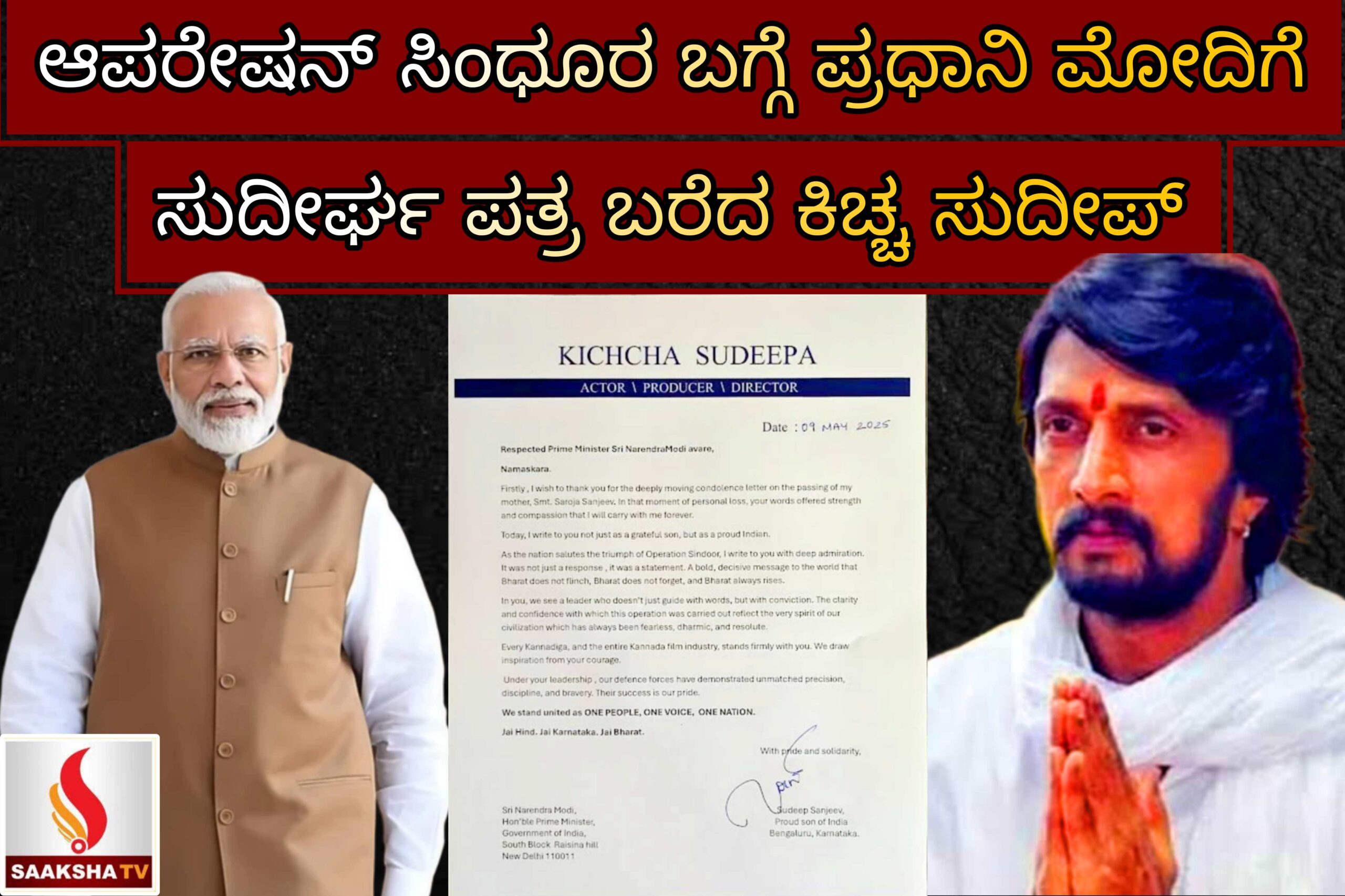 ಆಪರೇಷನ್ ಸಿಂಧೂರ್ ಎಂಬುದು ಭಾರತ ಸರ್ಕಾರ ಕೈಗೊಂಡ ಮಹತ್ವದ ಸೈನಿಕ ಕಾರ್ಯಚರಣೆಗಳಲ್ಲಿ ಒಂದು. ಈ ಕಾರ್ಯಚರಣೆಯ ಕುರಿತು ಪ್ರಧಾನಿ ಮೋದಿ ನೀಡಿದ ಸ್ಪಷ್ಟನೆ ಹಾಗೂ ಅವರ ದೇಶಭಕ್ತಿಯ ಭಾವನೆಗಳನ್ನು ಪ್ರತಿಬಿಂಬಿಸುತ್ತದೆ ಎಂಬ ಅಭಿಪ್ರಾಯವನ್ನು ಸುದೀಪ್ ವ್ಯಕ್ತಪಡಿಸಿದ್ದಾರೆ.