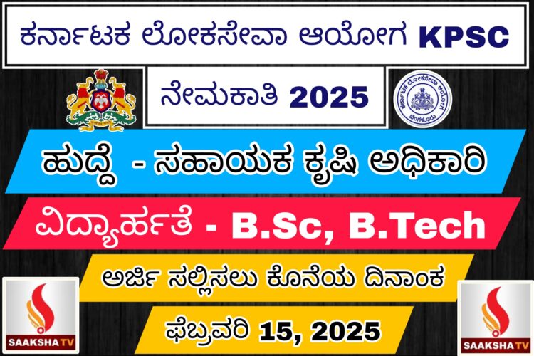 KPSC Recruitment 2025 – ಕರ್ನಾಟಕ ಲೋಕಸೇವಾ ಆಯೋಗ (KPSC) 2024ನೇ ಸಾಲಿನ ನೇಮಕಾತಿ ಅಧಿಸೂಚನೆಯನ್ನು ಪ್ರಕಟಿಸಿದೆ. 945 ಸಹಾಯಕ ಕೃಷಿ ಅಧಿಕಾರಿ (AAO) ಹುದ್ದೆಗಳ ನೇಮಕಾತಿಗಾಗಿ ಅರ್ಜಿ ಆಹ್ವಾನಿಸಲಾಗಿದೆ. ಅರ್ಹ ಮತ್ತು ಆಸಕ್ತ ಅಭ್ಯರ್ಥಿಗಳು KPSC ಅಧಿಕೃತ ವೆಬ್ಸೈಟ್ ಮೂಲಕ ನಿರ್ದಿಷ್ಟ ದಿನಾಂಕದೊಳಗೆ ಅರ್ಜಿ ಸಲ್ಲಿಸಬಹುದು.