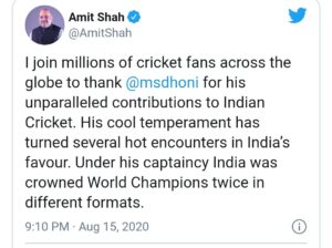 ಭಾರತೀಯ ಕ್ರಿಕೆಟ್‌ಗೆ ಸರಿಸಾಟಿಯಿಲ್ಲದ ಕೊಡುಗೆ ನೀಡಿರುವುದಕ್ಕೆ ಎಂ.ಎಸ್. ಧೋನಿ ಅವರಿಗೆ ಧನ್ಯವಾದ ಅರ್ಪಿಸುತ್ತಿರುವ ಲಕ್ಷಾಂತರ ಕ್ರಿಕೆಟ್ ಅಭಿಮಾನಿಗಳಲ್ಲಿ ನಾನು ಕೂಡ ಒಬ್ಬ . ಅವರ ಶಾಂತ ಸ್ವಭಾವದಿಂದ ಭಾರತ ತಂಡಕ್ಕೆ ಬಹಳಷ್ಟು ಸಹಾಯವಾಗಿದೆ. ಅವರ ನಾಯಕತ್ವದಲ್ಲಿ ಭಾರತವು ಎರಡು ಬಾರಿ ವಿಶ್ವ ಚಾಂಪಿಯನ್‌ಗಳಾಗಿ ಕಿರೀಟವನ್ನು ಧರಿಸಿದರು ಎಂದು ಶಾ ಟ್ವೀಟ್ ನಲ್ಲಿ ತಿಳಿಸಿದ್ದಾರೆ.
