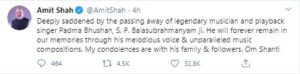 ಕೇಂದ್ರ ಗೃಹ ಸಚಿವ ಅಮಿತ್ ಶಾ ಅವರು “ ಲೆಜೆಂಡರಿ ಸಿಂಗರ್, ಪದ್ಮ ಭೂಷಣ್ ಎಸ್ ಪಿ ಬಾಲಸುಬ್ರಹ್ಮಣ್ಯಂ ಅವರ ಅಗಲಿಕೆಯಿಂದ ಬಹಳ ನೋವಾಗಿದೆ. ಅವರ ಹಾಡುಗಳ ಮೂಲಕ ನಮ್ಮ ನೆನಪಿನಲ್ಲಿ ಸದಾ ಅಮರ. ಅವರ ಪರಿವಾರ ಹಾಗೂ ಅಭಿಮಾನಿಗಳಿಗೆ ನನ್ನ ಸಂತಾಪ. ಓಂ ಶಾಂತಿ.” ಎಂದು ಸಂತಾಪ ಸೂಚಿಸಿದ್ದಾರೆ.