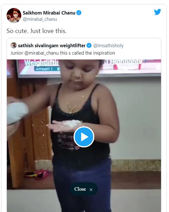 ಈ ಮಗುವಿನ ಮುದ್ದಾದ ವಿಡಿಯೋ ಸೋಷಿಯಲ್ ಮೀಡಿಯಾದಲ್ಲಿ ಹರಿದಾಡ್ತಾಯಿದ್ದು, ವಿಶೇಷ ಅಂದ್ರೆ ಖುದ್ದು ಮೀರಾಬಾಯ್ ಚಾನು ಇದಕ್ಕೆ ಪ್ರತಿಕ್ರಿಯೆ ನೀಡಿದ್ದಾರೆ.. “ ಸೋ ಕ್ಯೂಟ್ ಜಸ್ಟ್ ಲವ್ ದಿಸ್ “ ಎಂದು ಕಮೆಂಟ್  ತಿಳಿಸಿದ್ದಾರೆ. ಈ ವಿಡಿಯೋವನ್ನ ಮಾಜಿ ಕಾಮನ್ ವೆಲ್ತ್ ಗೋಲ್ಡ್ ಮೆಡಲಿಸ್ಟ್ ಸತೀಶ್ ಶಿವಲಿಂಗಮ್ ಶೇರ್ ಮಾಡಿದ್ದು, ಭಾರೀ ವೈರಲ್ ಆಗಿದೆ.. ಅಲ್ಲದೇ ಇದಕ್ಕೆ “ ಮೇರಾಬಾಯ್ ಚಾನು ಇನ್ಸಪಿರೇಷನ್ “ ಅಂತ ನೀಡಲಾಗಿದೆ..