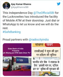 ಎಸ್ಬಿಐ ಲಕ್ನೋ ಸರ್ಕಲ್ನ ಮುಖ್ಯ ಪ್ರಧಾನ ವ್ಯವಸ್ಥಾಪಕ ಅಜಯ್ ಕುಮಾರ್ ಖನ್ನಾ ಅವರು ತಮ್ಮ ಟ್ವಿಟ್ಟರ್ ಖಾತೆಯಲ್ಲಿ ‘ನಿಮ್ಮ ಬೇಡಿಕೆಯ ಮೇರೆಗೆ ಎಟಿಎಂ ಅಟ್ ಯುವರ್ ಡೋರ್’ ಸೇವೆಯನ್ನು ಲಕ್ನೋ ಜನರಿಗೆ ಸ್ವಾತಂತ್ರ್ಯ ದಿನಾಚರಣೆಯಂದು ಪ್ರಾರಂಭಿಸಲಾಗಿದೆ ಎಂದು ಮಾಹಿತಿ ನೀಡಿದರು. ಗ್ರಾಹಕರು ಬ್ಯಾಂಕಿಗೆ ಕರೆ ಅಥವಾ ವಾಟ್ಸಾಪ್ ಮೂಲಕ ಈ ಸೇವೆಯನ್ನು ಪಡೆಯಬಹುದು ಮತ್ತು ಎಸ್ಬಿಐ ಅವರಿಗೆ ಮನೆ ಬಾಗಿಲಲ್ಲಿ ಮೊಬೈಲ್ ಎಟಿಎಂ ಒದಗಿಸುತ್ತದೆ.