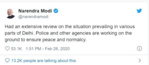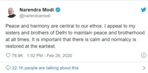 ಟ್ರಂಪ್ ಆಗಮನದಲ್ಲಿ ಬ್ಯುಸಿ ಆಗಿದ್ದ ಮೋದಿ ಬುಧವಾರ ಎರಡು ಟ್ವೀಟ್ಗಳಲ್ಲಿ ಪರಿಸ್ಥಿತಿಯನ್ನು ಪರಿಶೀಲಿಸಲಾಗಿದೆ ಮತ್ತು ಭದ್ರತಾ ಸಂಸ್ಥೆಗಳು ತಮ್ಮ ಕೆಲಸವನ್ನು ಮಾಡುತ್ತಿವೆ ಎಂದು ಹೇಳಿದರು. ಸುಪ್ರೀಂ ಕೋರ್ಟ್, ದೆಹಲಿ ಹೈಕೋರ್ಟ್ ಮತ್ತು ಪೊಲೀಸರು ತಮ್ಮ ಕೆಲಸವನ್ನು ಮಾಡುತ್ತಿಲ್ಲ ಸೇರಿದಂತೆ ಹಲವಾರು ವರದಿಗಳು ಮತ್ತು ಟೀಕೆಗಳನ್ನು ಅಲ್ಲಗೆಳೆದರು ಪ್ರಧಾನಿ ಶಾಂತಿ ಮತ್ತು ಸಾಮರಸ್ಯದ ಕಾಪಾಡಲು ಜನರಲ್ಲಿ ಮನವಿ ಮಾಡಿದರು.
