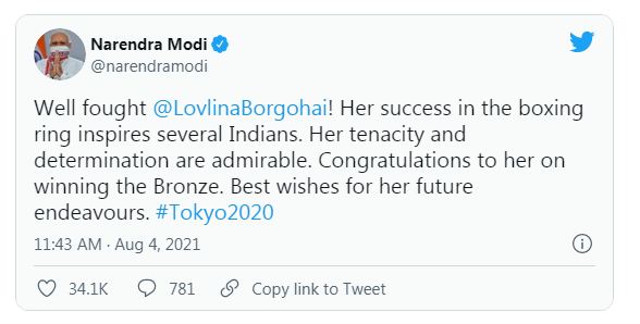 ಬಾಕ್ಸಿಂಗ್ ನಲ್ಲಿ ಕಂಚು ಗೆದ್ದ ಲವ್ಲಿನಾ ಬೊರ್ಗೊಹೈನ್‌ ಗೆ ಪ್ರದಾನಿ ನರೇಂದ್ರ ಮೋದಿ ಶುಭಾಶಯ ಕೋರಿದ್ದಾರೆ. ಟ್ವೀಟ್ ಮಾಡಿರುವ ಮೋದಿಯವರು, ಆಟದಲ್ಲಿ ಉತ್ತಮ ಹೋರಾಟ ಮಾಡಿದಿರಿ ಲವ್ಲಿನಾ ಬೊರ್ಗೊಹೈನ್‌, ಬಾಕ್ಸಿಂಗ್ ನಲ್ಲಿ ಲವ್ಲಿನಾರ ಯಶಸ್ಸು ಹಲವಾರು ಭಾರತೀಯರಿಗೆ ಸ್ಫೂರ್ತಿ ನೀಡುತ್ತದೆ. ಆಕೆಯ ದೃಢತೆ ಮತ್ತು ತೆಗೆದುಕೊಳ್ಳುವ ನಿರ್ಣಯಗಳು ಶ್ಲಾಘನೀಯವಾಗಿದೆ. ಟೊಕಿಯೊ ಒಲಂಪಿಕ್ಸ್ ನಲ್ಲಿ ಕಂಚು ಗೆದ್ದ ಲವ್ಲಿನಾ ಅವರಿಗೆ ಅಭಿನಂದನೆಗಳು. ಅವರ ಮುಂದಿನ ಭವಿಷ್ಯಕ್ಕೆ ಶುಭ ಹಾರೈಸುತ್ತೇನೆ ಎಂದು ಹೇಳಿದ್ದಾರೆ.