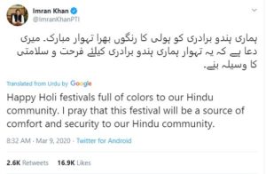 ಪಾಕಿಸ್ತಾನದಲ್ಲಿರುವ ಅಲ್ಪಸಂಖ್ಯಾತ ಹಿಂದೂಗಳ ಹಬ್ಬಕ್ಕೆ ಪಾಕ್ ಪ್ರಧಾನಿ ಇಮ್ರಾನ್ ಖಾನ್ ಶುಭ ಕೋರಿದ್ದಾರೆ. ಭಾರತ ದೇಶದ ಹಿಂದೂಗಳು ಮಾರ್ಚ್ ಒಂಬತ್ತು ರಂದು ಹೋಳಿ ಹಬ್ಬ ಆಚರಿಸಿದ್ದರು. ಹೋಳಿ ಹಬ್ಬ ಆಚರಣೆ ಮಾಡುವ ಸಂಪ್ರದಾಯ ಪಾಕಿಸ್ತಾನದಲ್ಲಿರುವ ಅಲ್ಪಸಂಖ್ಯಾತ ಹಿಂದೂಗಳ ನಡೆಸಿಕೊಂಡು ಬಂದಿದ್ದಾರೆ.ಅದರ ಭಾಗವಾಗಿ ಹಿಂದೂಗಳು ಸೋಮವಾರ ಮತ್ತು ಮಂಗಳವಾರ ಪಾಕಿಸ್ತಾನದಲ್ಲಿ ಹೋಳಿ ಹಬ್ಬ ಆಚರಣೆ ಮಾಡುತ್ತಾರೆ. ಹಿಂದೂಗಳು ಆಚರಿಸುವ ಹೋಳಿ ಹಬ್ಬಕ್ಕೆ ಪಾಕ್ ಪ್ರಧಾನಿ ಇಮ್ರಾನ್ ಖಾನ್ ಟ್ವೀಟ್ ಮಾಡುವ ಮೂಲಕ ಶುಭ ಹಾರೈಸಿದ್ದಾರೆ.ತಮ್ಮ ಟ್ವೀಟ್ ನಲ್ಲಿ ನಮ್ಮ ಎಲ್ಲಾ ಹಿಂದೂ ಸಮುದಾಯದವರಿಗೆ ತುಂಬಾ ಸಂತೋಷ ಮತ್ತು ಶಾಂತಿಯತ ಹೋಳಿ, ಬಣ್ಣಗಳ ಹಬ್ಬ ಎಂದು ಹೇಳಿದ್ದಾರೆ. ವಿಶೇಷ ಎಂದರೆ ಬಲೂಚಿಸ್ತಾನ್ ಪ್ರಾಂತೀಯ ಸರ್ಕಾರವು ಹೋಳಿ ಹಬ್ಬ ಆಚರಣೆಗೆಗಾಗಿ ಹಿಂದೂಗಳಿಗೆ ಎರಡು ದಿನ ರಜೆ ನೀಡಿದೆ.