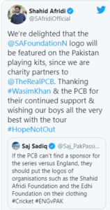 ಲೋಗೋ ರಾರಾಜಿಸಲಿದೆ. ಈ ವಿಷಯವನ್ನು ಸ್ವತಃ ಶಾಹೀದ್ ಆಫ್ರಿದಿ ಅವರೇ ಟ್ವಿಟರ್ ನಲ್ಲಿ ಬರೆದುಕೊಂಡಿದ್ದಾರೆ. ಶಾಹೀದ್ ಆಫ್ರಿದಿ ಪೌಂಡೇಶನ್ ಲೋಗೋ ಪಾಕಿಸ್ತಾನ ಕ್ರಿಕೆಟಿಗರ ಕಿಟ್ನಲ್ಲಿ ಕಾಣಬಹುದು. ಯಾಕಂದ್ರೆ ನಾವು ಚಾರಿಟಿ ಪಾಟ್ನರ್ಗಳಾಗಿದ್ದೇವೆ. ವಾಸೀಮ್ ಖಾನ್ ಮತ್ತು ಪಿಸಿಬಿಗೆ ಧನ್ಯವಾದಗಳು. ಇದೇ ರೀತಿಯ ಬೆಂಬಲ ಮುಂದೆಯೂ ಇರಲಿ. ಪಾಕ್ ತಂಡದ ಆಟಗಾರರಿಗೆ ಆಲ್ ದಿ ಬೆಸ್ಟ್ ಅಂತ ಶಾಹೀದ್ ಆಫ್ರಿದಿ ತನ್ನ ಟ್ವಿಟರ್ನಲ್ಲಿ ಬರೆದುಕೊಂಡಿದ್ದಾರೆ.