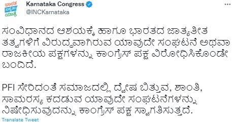 ಈ ಬಗ್ಗೆ ರಾಜ್ಯ ಕಾಂಗ್ರೆಸ್ ಟ್ವೀಟ್ ಮಾಡಿದ್ದು, ಸಂವಿಧಾನದ ಆಶಯಕ್ಕೆ ಹಾಗೂ ಭಾರತದ ಜಾತ್ಯತೀತ ತತ್ವಗಳಿಗೆ ವಿರುದ್ಧವಾಗಿರುವ ಯಾವುದೇ ಸಂಘಟನೆ ಅಥವಾ ರಾಜಕೀಯ ಪಕ್ಷಗಳನ್ನು ಕಾಂಗ್ರೆಸ್ ಪಕ್ಷ ವಿರೋಧಿಸಿಕೊಂಡೇ ಬಂದಿದೆ. PFI ಸೇರಿದಂತೆ ಸಮಾಜದಲ್ಲಿ ದ್ವೇಷ ಬಿತ್ತುವ, ಶಾಂತಿ, ಸಾಮರಸ್ಯ ಕದಡುವ ಯಾವುದೇ ಸಂಘಟನೆಗಳನ್ನು ನಿಷೇಧಿಸುವುದನ್ನು ಕಾಂಗ್ರೆಸ್ ಪಕ್ಷ ಸ್ವಾಗತಿಸುತ್ತದೆ ಎಂದು ಬರೆದುಕೊಂಡಿದೆ.