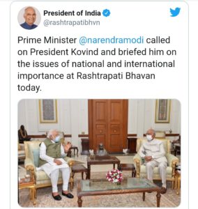 ಹಾಗಾಗಿ ಪ್ರಧಾನಿ ಮೋದಿ ರಾಷ್ಟ್ರಪತಿ ಕೋವಿಂದ್ ಜೊತೆಗೆ ಪ್ರಸ್ತುತ ವಿದ್ಯಮಾನಗಳ ಕುರಿತು ಸುದೀರ್ಘ ಚರ್ಚೆ ನಡೆಸಿದ್ದಾರೆ ಎಂದು ಹೇಳಲಾಗಿದೆ. ರಾಷ್ಟ್ರಪತಿ ಭವನ ಈ ಬಗ್ಗೆ ಸ್ಪಷ್ಟನೆ ನೀಡಿದ್ದು, ಪ್ರಸ್ತುತ ರಾಷ್ಟ್ರೀಯ ಹಾಗೂ ಅಂತಾರಾಷ್ಟ್ರೀಯ ವಿದ್ಯಮಾನಗಳ ಕುರಿತು ಇಬ್ಬರೂ ನಾಯಕರು ಚರ್ಚೆ ನಡೆಸಿದ್ದಾರೆ ಎಂದು ತಿಳಿಸಿದೆ.